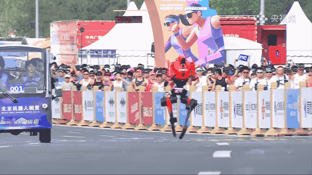 带大家康康今天赛道上最值得被截图保存的名场面。现场观众看得津津有味,连人类跑手都在起跑区主动为机器人加油,画面莫名带感。