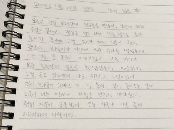 让GPT帮我翻译了下,确实不是乱码,大概是一份韩国高中生日记,内容是周日早上和朋友们上完补习班后,下午去喝了咖啡,觉得有朋友真好,巴拉巴拉……