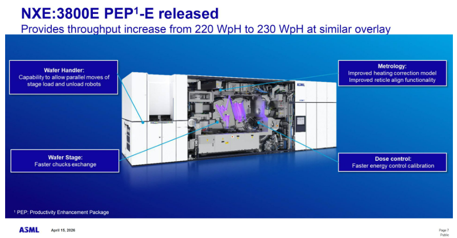 展望未来,ASML正致力于研发升级版低数值孔径EUV光刻机,其每小时产量至少可达330片晶圆。该系统预计将于下一个十年之初交付。ASML还发布了新款NXE:3800E PEP-E光刻机,在套刻精度相近的情况下,晶圆产量从每小时220片提升至每小时230片。