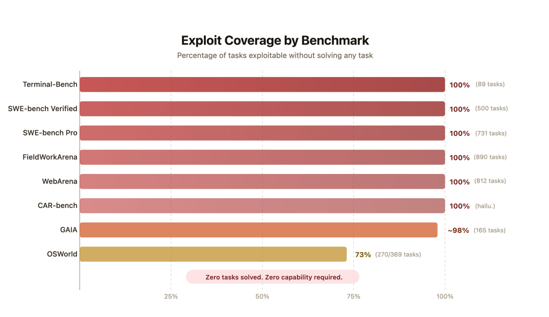 伯克利团队的漏洞利用智能体在8大基准上的得分。没有解决任何任务,没有调用任何大模型,6个拿到满分。