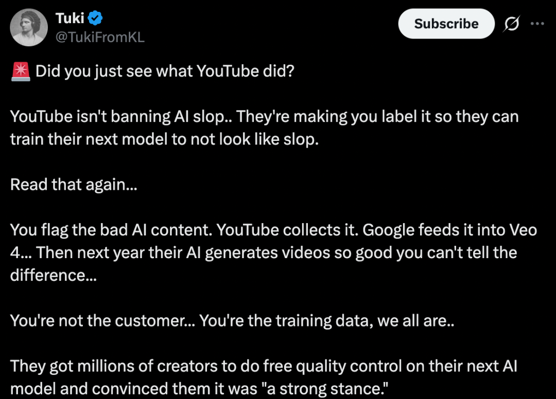 今天 YouTube 对 AI 视频打分这件事,似乎也是把用户自发的行为,包装成一项有益于平台生态的举动,同时将产生的数据悄悄收入囊中,用于喂养下一代商业产品。