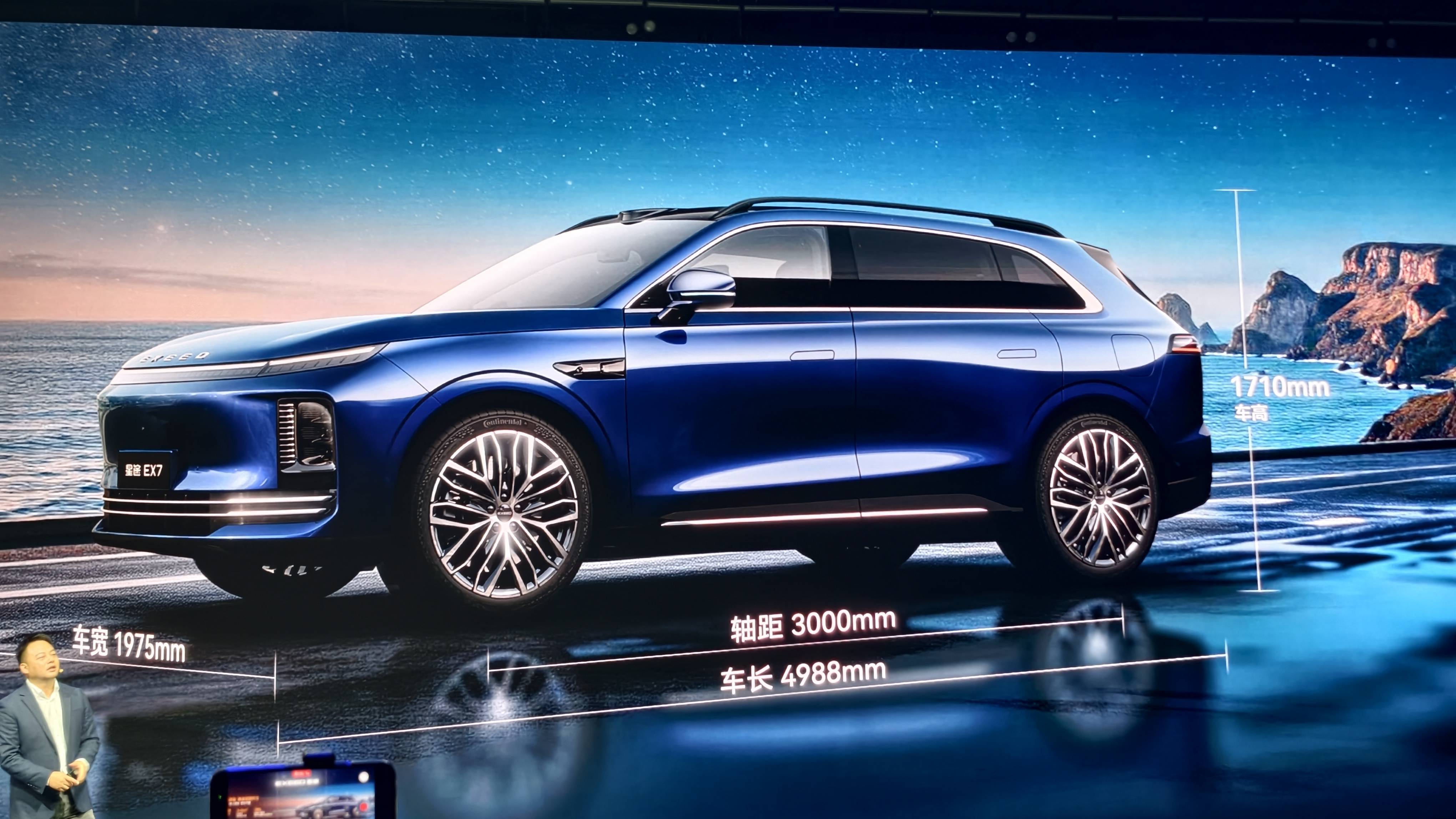 星途 EX7 采用了「星际美学」设计语言,长宽高分别达到了 4988mm、1975mm 和 1710mm,轴距长达 3000mm。在现场,高管团队将这种车身比例简单概括为「532」。