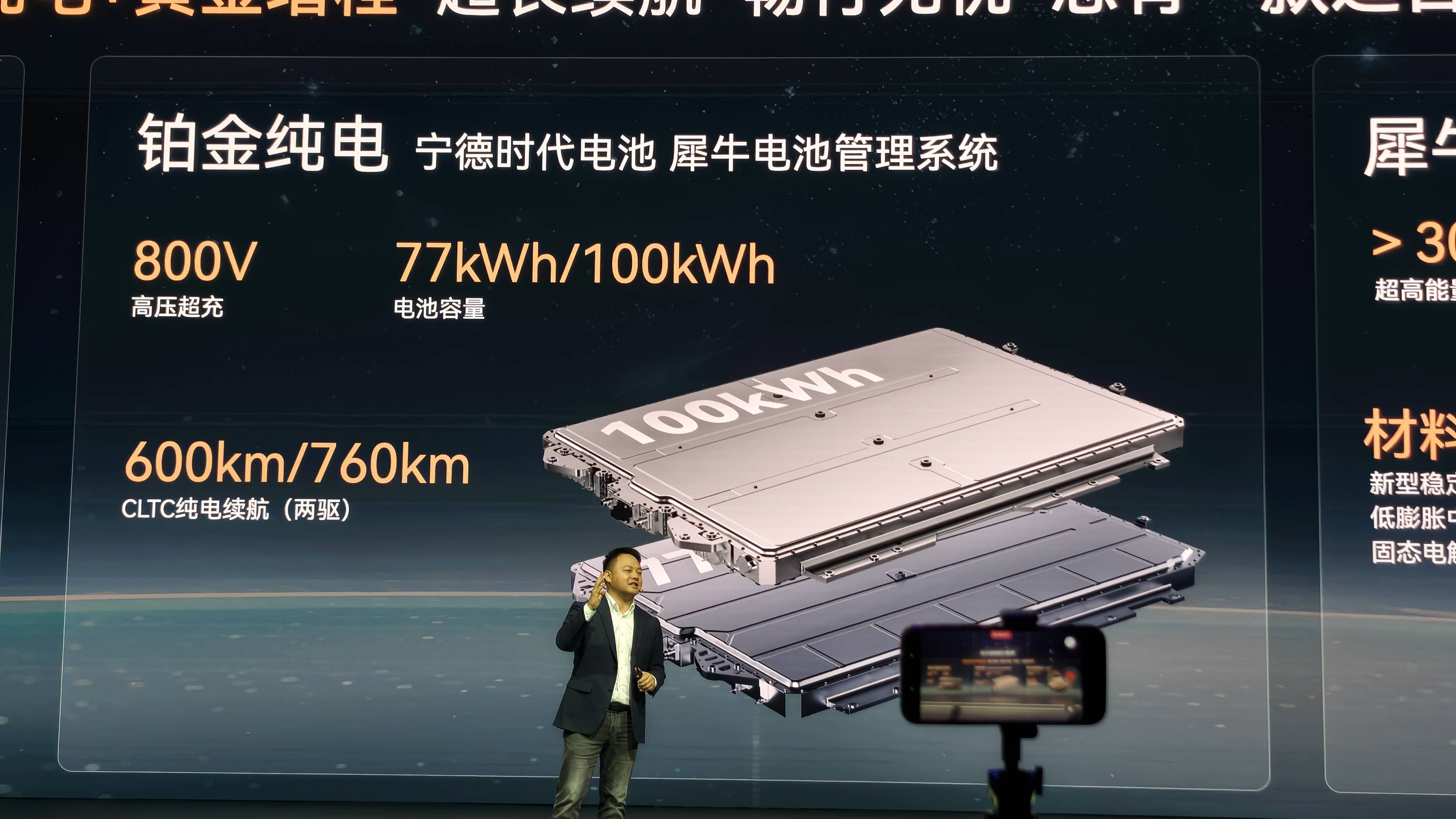 纯电版全系基于 800V 高压平台打造。它提供了 70.01 度和 100.26 度两款宁德时代电池,对应的 CLTC 续航里程分别为 600、682 和 726 公里。