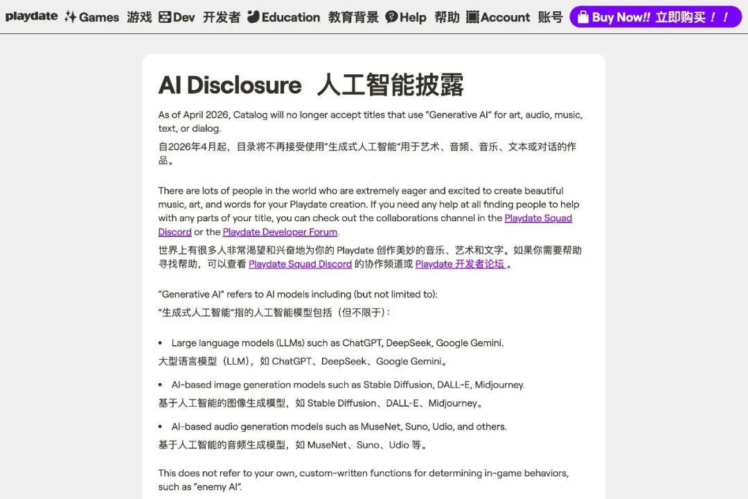 日前,Panic 宣布,旗下 Playdate 游戏商店 Catalog 将不再接受使用生成式 AI 制作美术、音频、音乐、文字或对话内容的游戏作品,第三季游戏合集亦全面禁止以任何形式使用生成式 AI 开发的作品。