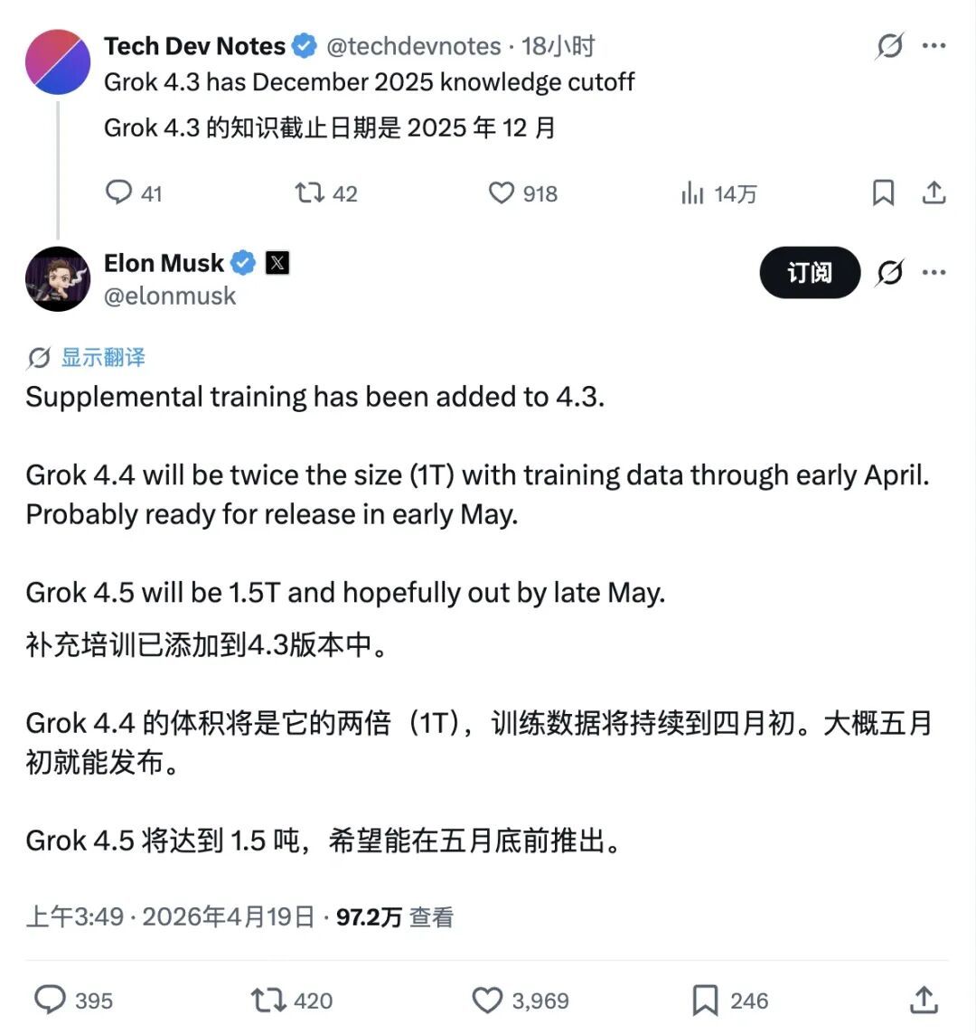 Grok 4.4 参数规模将翻倍至 1T,训练数据覆盖至今年 4 月初,预计今年 5 月初发布;