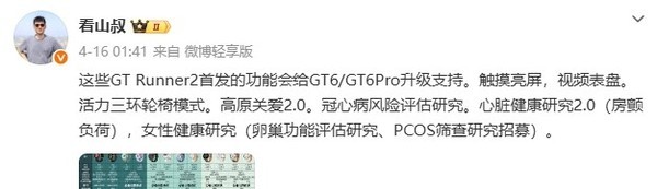 在健康功能方向,爆料中提及的“房颤负荷”等指标与研究项目,若后续在GT 6系列落地,意味着部分Runner 2的健康研究能力有望扩展到GT产品线。