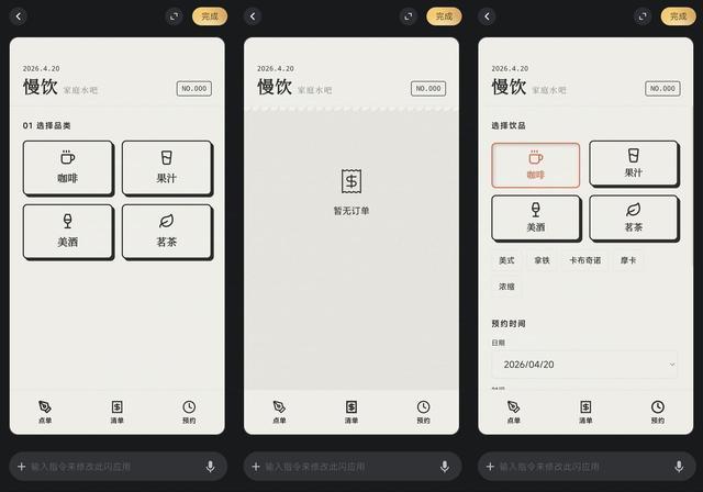 举一个例子:某用户在灵光圈中发布了一个“家庭水吧”闪应用,另一个用户觉得功能有用但想新增一个预约功能,于是通过“改一下”描述了修改意图,系统基于原应用的意图结构重新生成了一个带有预约功能的新版本。整个过程没有接触一行代码,也不需要理解原应用的实现逻辑。