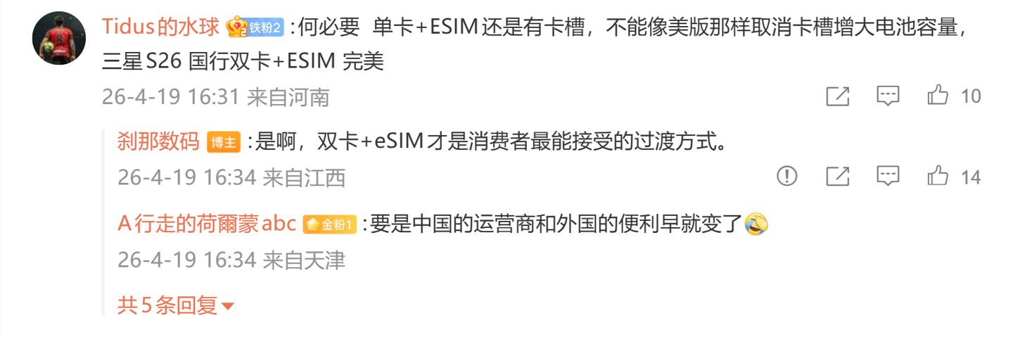 后续有用户在评论区表示:“何必要单卡 +ESIM 还是有卡槽,不能像美版那样取消卡槽增大电池容量, 三星 S26 国行双卡 +ESIM 完美”,博主回复道:“是啊,双卡 +eSIM 才是消费者最能接受的过渡方式”。