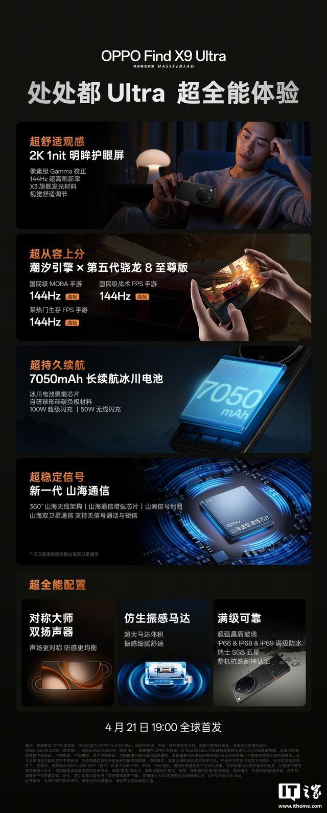 IT之家 4 月 19 日消息,OPPO 官方今日公布了 Find X9 Ultra 的部分核心亮点,这款旗舰新机将在 4 月 21 日 19:00 全球首发。