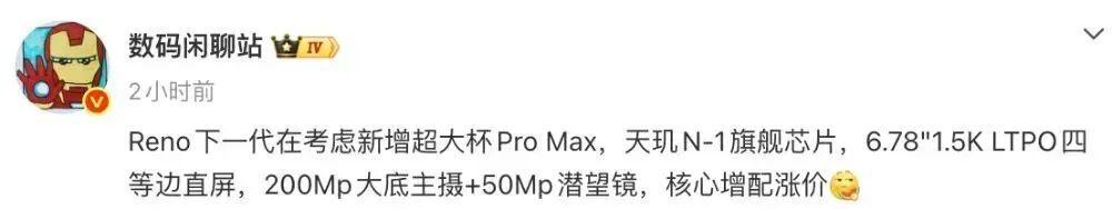 当时的消息显示,Reno下一代在考虑新增超大杯Pro Max,天玑N-1旗舰芯片,6.78"1.5K LTPO四等边直屏,200Mp大底主摄+50Mp潜望镜,核心增配涨价。