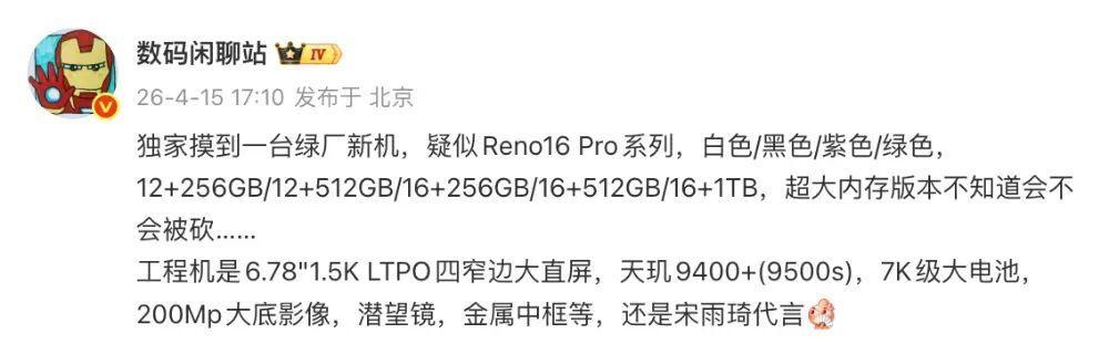 今天,博主@数码闲聊站 的一份爆料中显示,一款疑似OPPO Reno16 Pro系列的新机将提供白色、黑色、紫色、绿色几款配色,带来12+256GB、12+512GB、16+256GB、16+512GB、16+1TB等存储组合,但不知道超大内存版本会不会被取消。