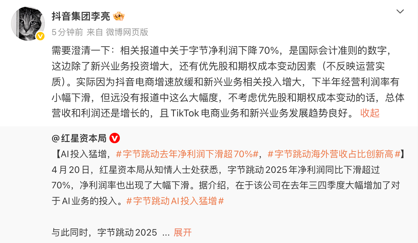 凤凰网科技讯 4月20日,针对“字节跳动去年净利下滑超70%”的相关消息,抖音集团副总裁李亮发文表示,远没有报道中这么大幅度。
