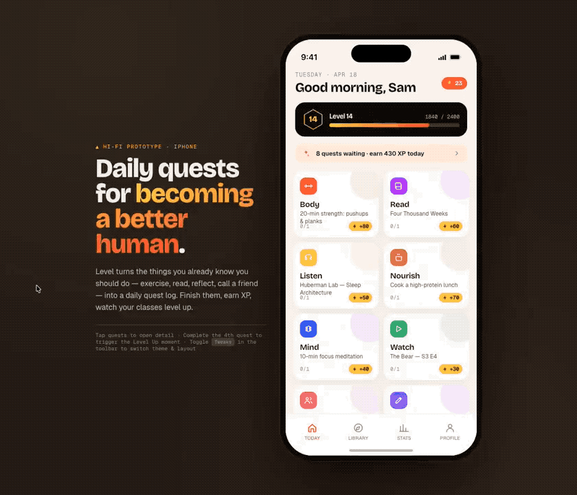 无论是何种类型的 APP,Claude Design 都能找到最适合对应主题的设计方案。有网友设计了一个简单的、基于 AI 的游戏化生活管理应用程序,在生成的原型图里,有经典的热力图、各种成就等级系统,和课程等详细内容