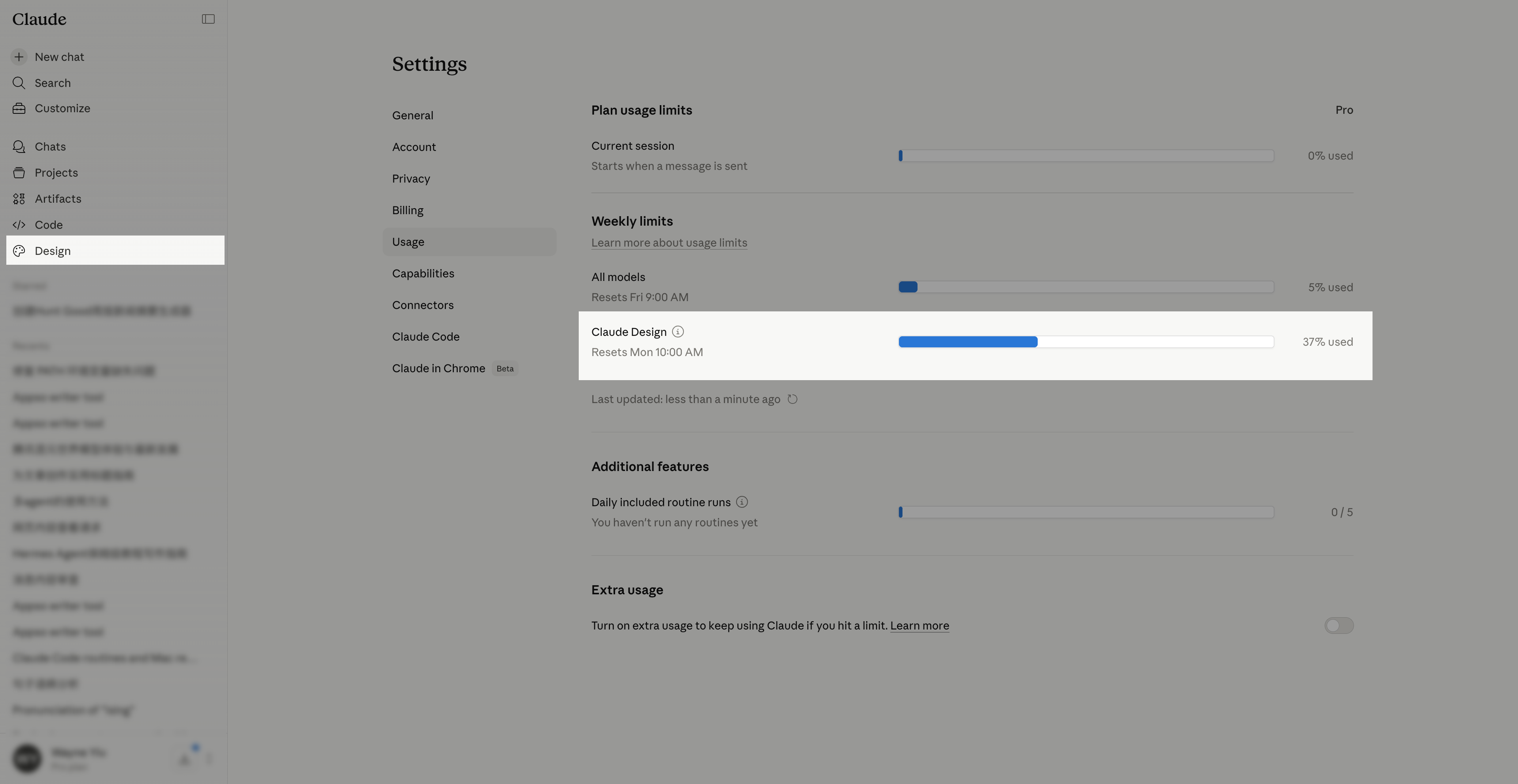 目前 Claude Design 仅向 Pro、Max、Team 和 Enterprise 订阅用户开放,并且有每周额度限制。我们在创建三个 Claude Design 任务之后,基本上都是动效风格比较丰富的项目,占据了 37% 的周额度。