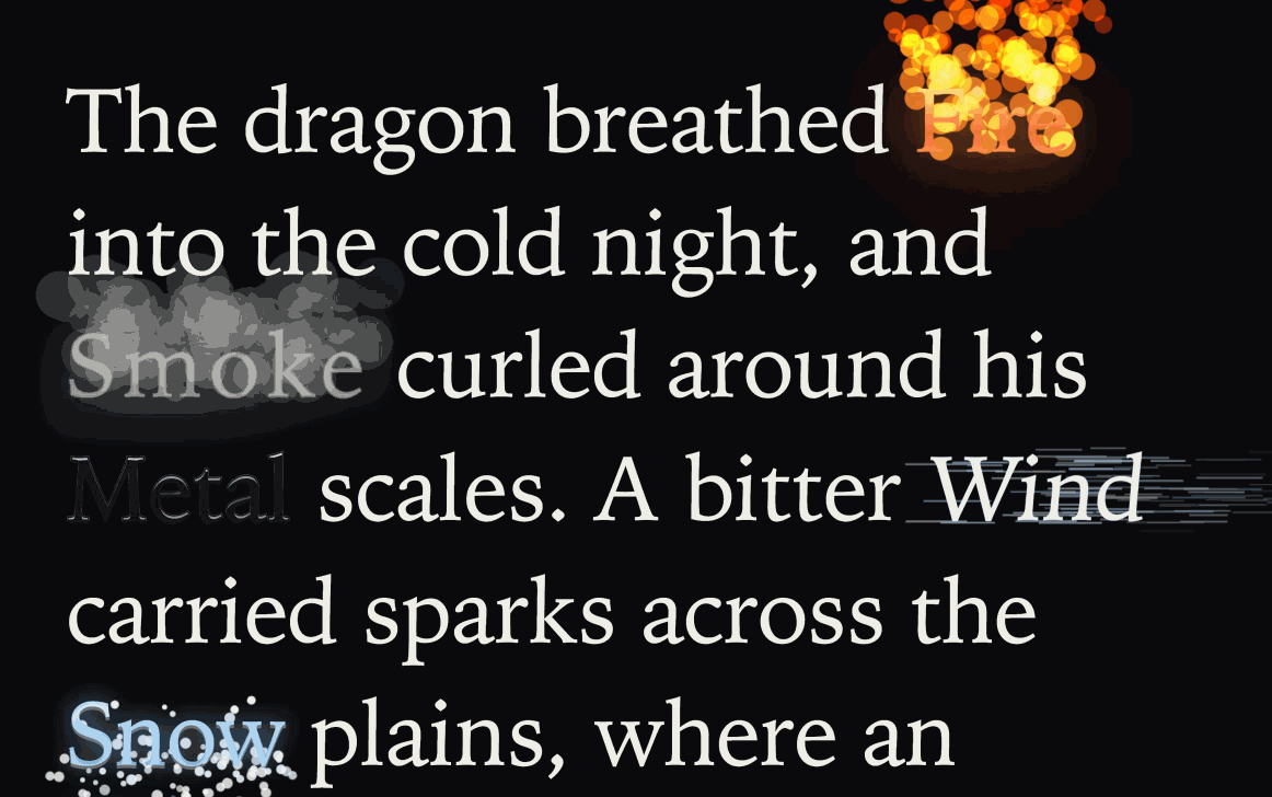 ▲提示词:创建一个非常大的可编辑文本框,预先填充示例文本。对于某些词语,例如「火」、「烟」、「金属」、「风」,渲染与这些词语相匹配的视觉效果和粒子效果。