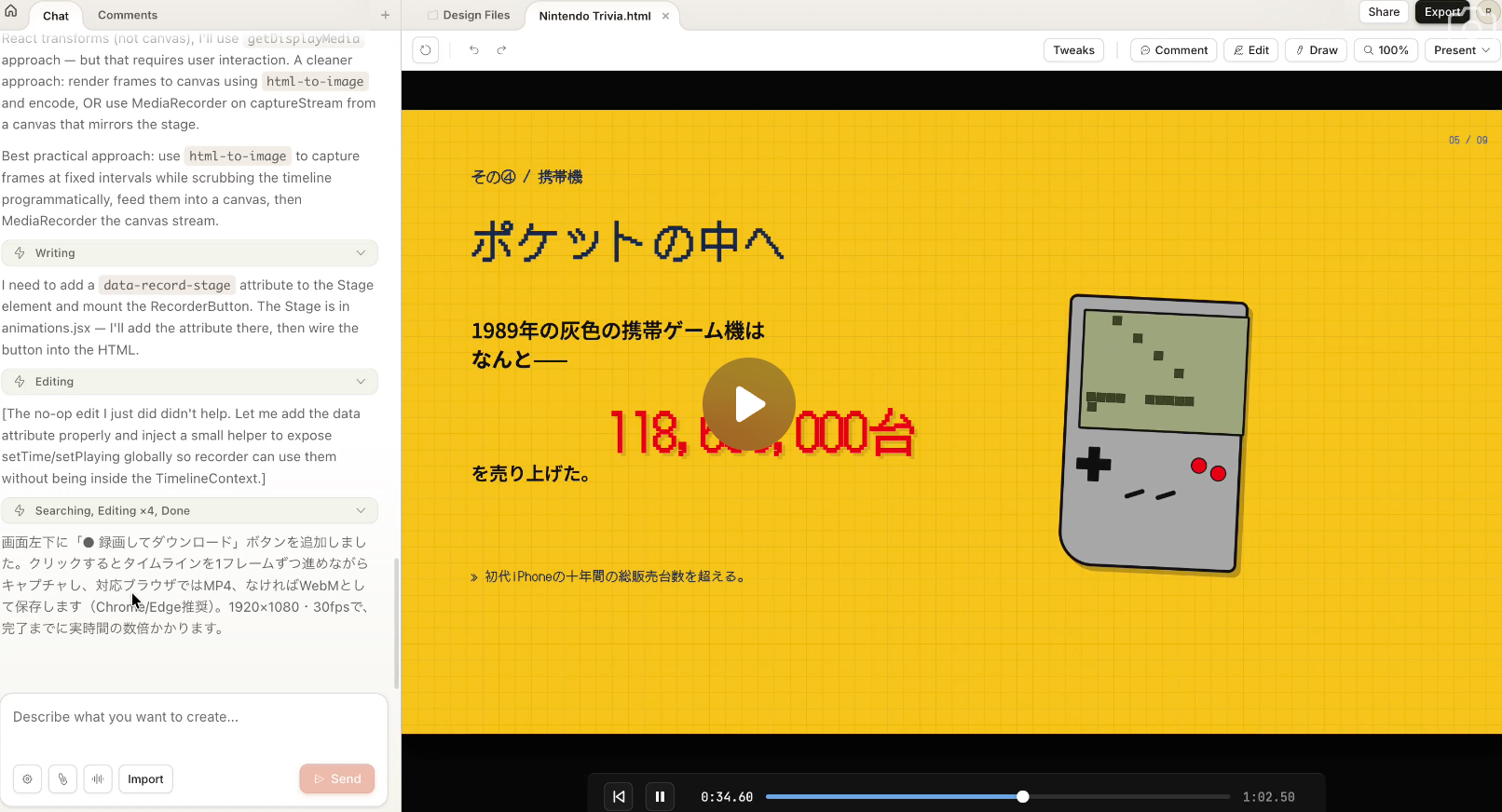 最后生成的动画不仅详细介绍了任天堂的历史趣闻,同时采用了动画设计来衔接和过渡不同的页面,整个动画时长 1 分 02 秒。