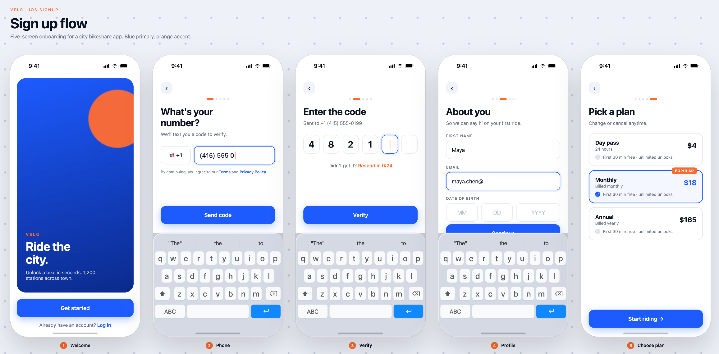 ▲提示词:为一款共享单车应用创建一个简单的 iOS 注册流程。在画布上展示界面。采用蓝橙相间的现代配色方案。