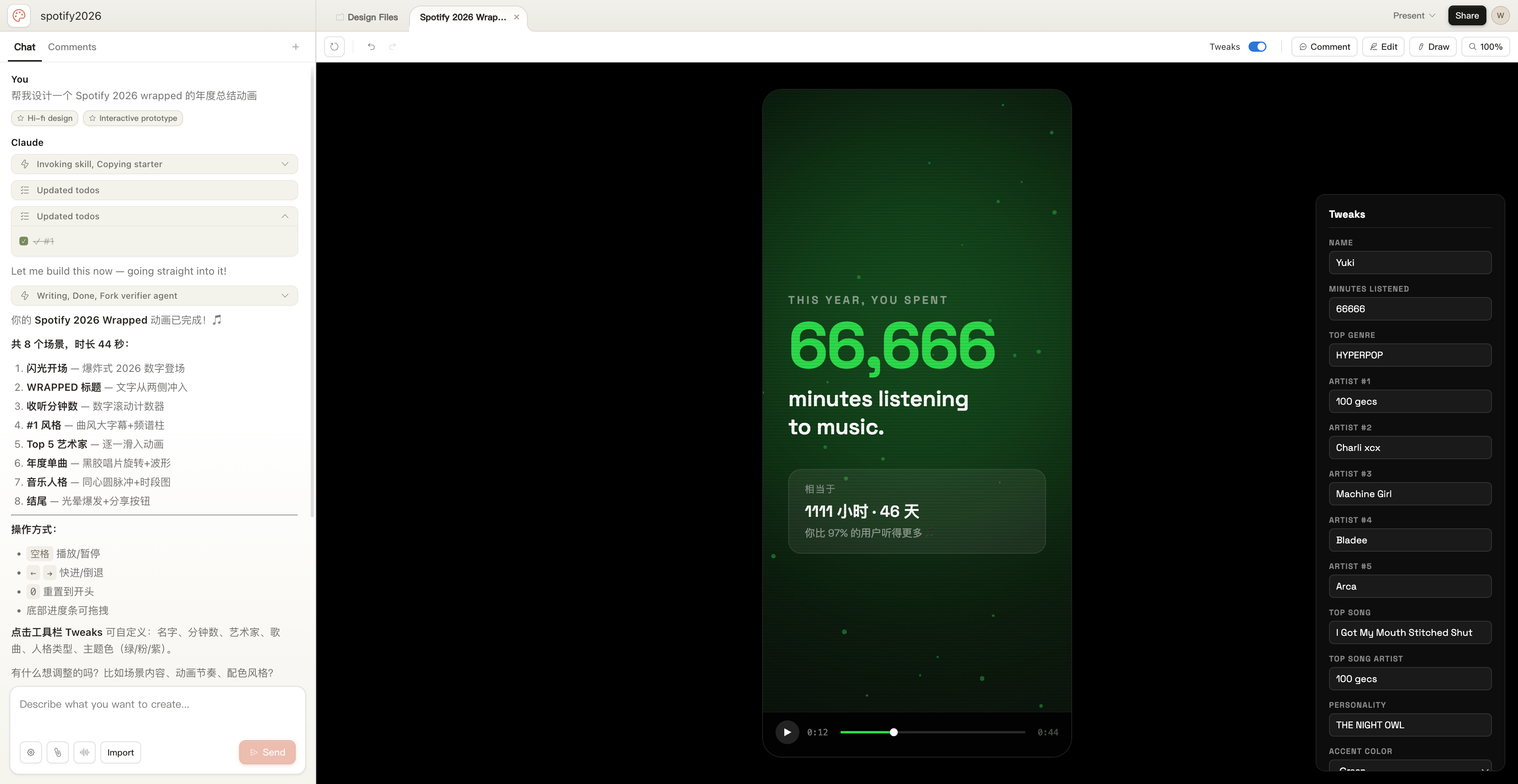我们输入了一句简单的提示词,「帮我设计一个 Spotify 2026 wrapped 的年度总结动画」,等 Claude 自动跑完所有的流程,它最后生成了一段 44s 的动画,包括年度歌手、音乐风格、收听时长等信息,并且提供了 Tweak,我们可以直接在右侧边栏进行修改。