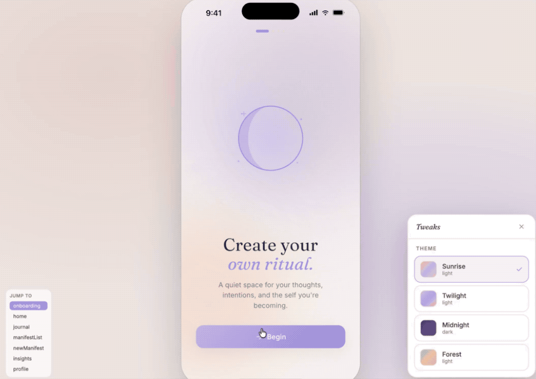 部分提示词:设计一款名为「Lumi」的 iOS 和 Android 移动应用——一款以灵性健康为主题,专注于日记和显化功能的应用。期望输出:每个主屏幕:高分辨率浅色和深色模式的模型、交互式原型流程(最少:引导 → 主页 → 创建新清单 → 撰写日志 → 查看见解)、组件库(按钮、输入框、卡片、底部面板、芯片、模态框变体)和设计系统文档(颜色、排版、间距、立面)。