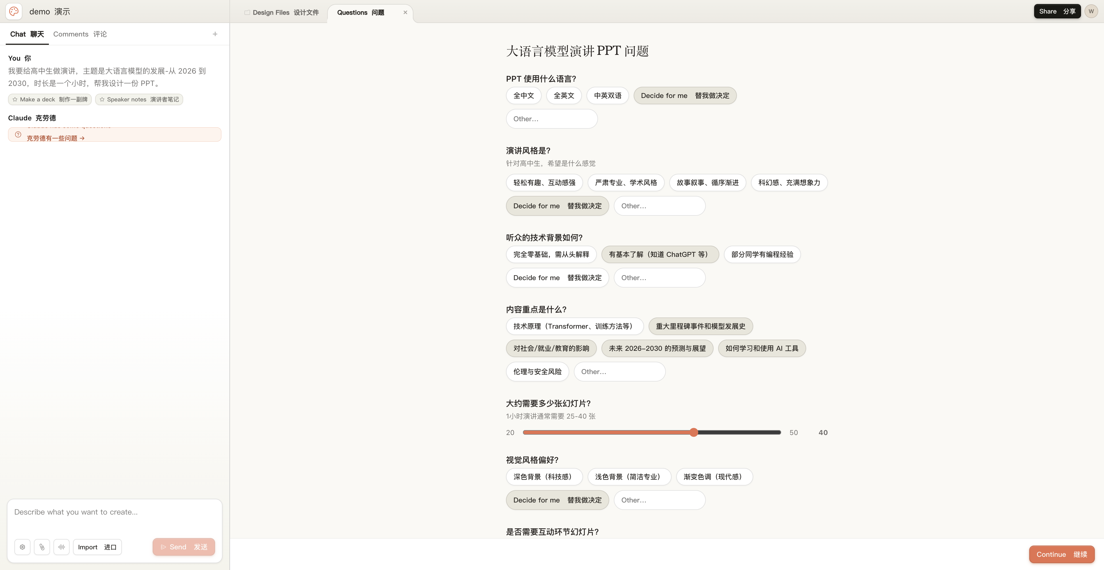 在测试 PPT 制作时,我们发送了一句简单的提示词,Claude 会生成一份问卷,要求我们回答,最后的 PPT 是什么形态,例如语言的要求、页数的要求、演讲者备注是否要详细、听众技术背景等等。