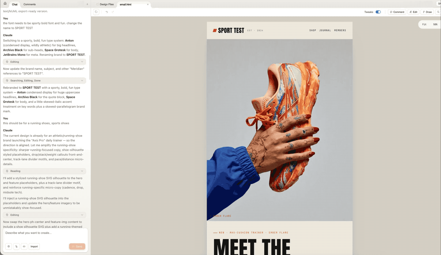 其他的办公场景,像是营销邮件的设计,通过上传自己的图片素材和商业广告信息给 Claude Design,它会自动编排好所有的内容,再简单的迭代优化之后,能得到可以直接发给潜在用户的广告邮件。