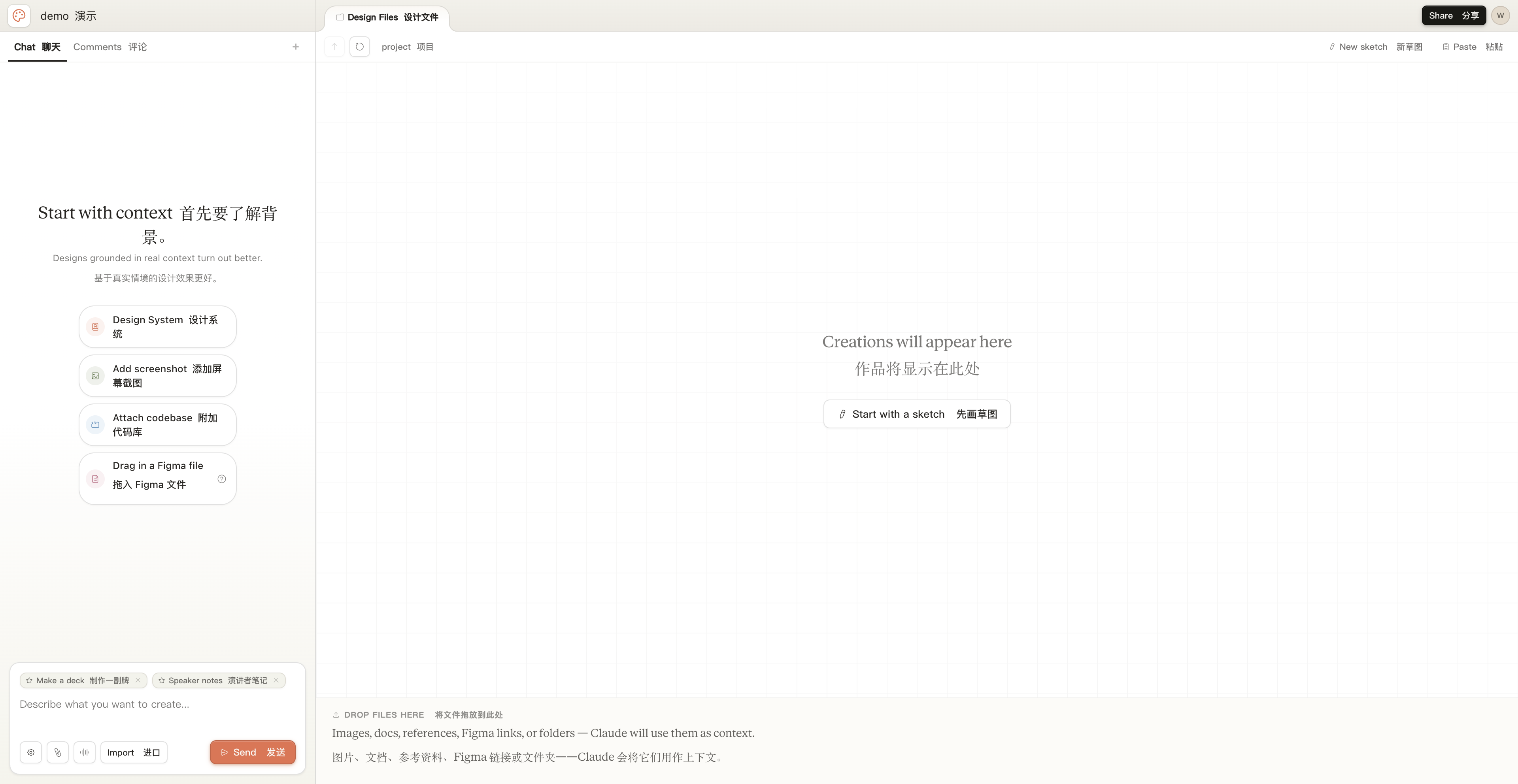 输入项目名字,点击创建,来到项目首页。Claude Design 在左侧边栏为我们提供了对话窗口,而在右边则可以用先画草图的方式,让 Claude Design 通过草图来完成设计。