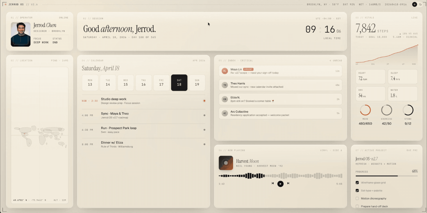 除了落地页,还有网友生成了一个个人仪表盘,把每天的日程、健康信息、以及待办事项等信息放在一个页面,并且能自动切换夜间和白天模式。