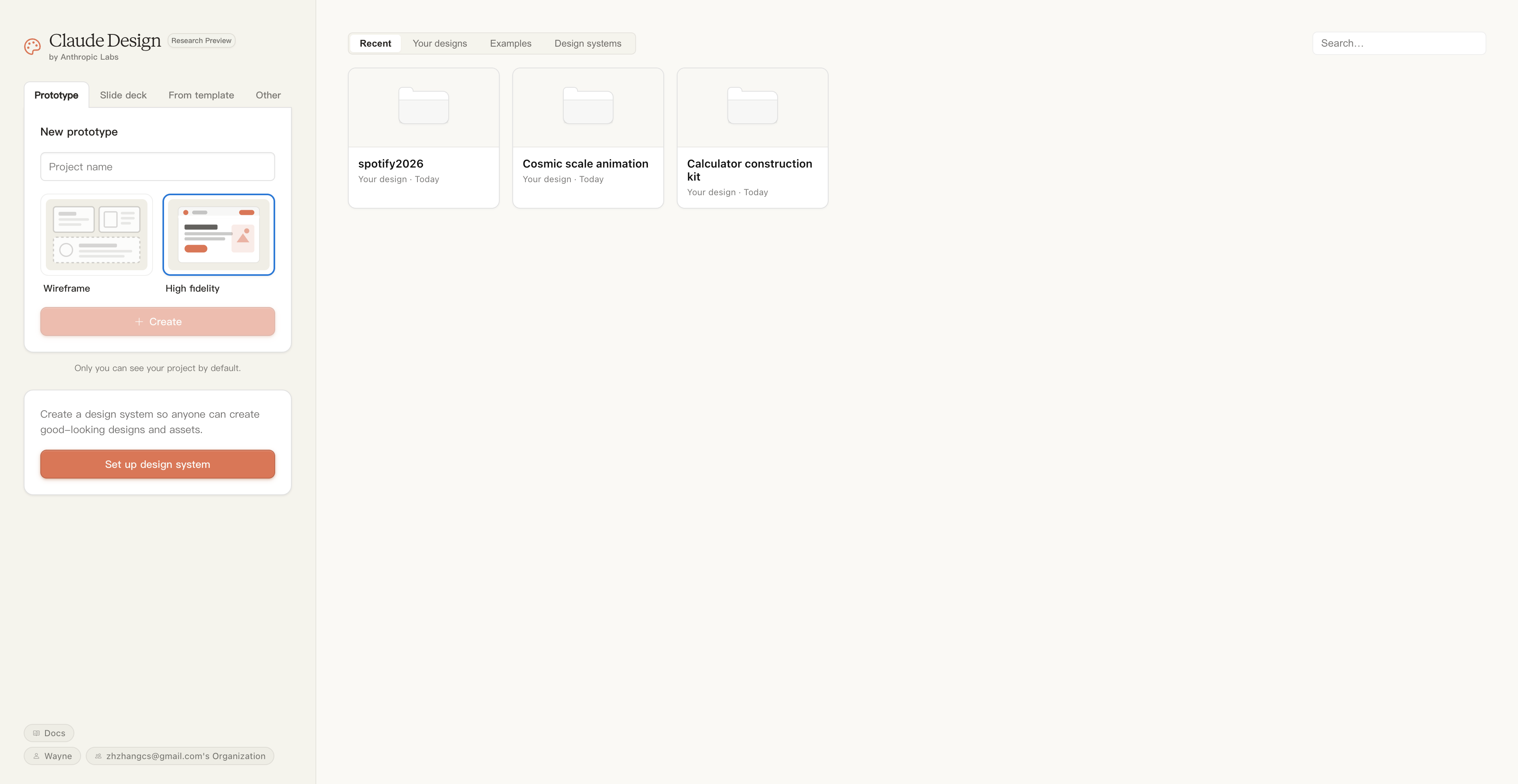 和一般的网页生成 Agent 工具不同,Claude 并没有在首页放一个大大的对话框,而是大多数的传统设计工具一样。主页左边可以让我们新建不同的项目,原型、幻灯片、从模板开始或者其他类型,还有一个设计系统的设置。