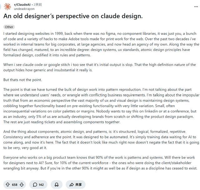 拥有二十多年从业经验的设计师在Reddit上分享的Claude Design行业视角分析帖(图源:Reddit)