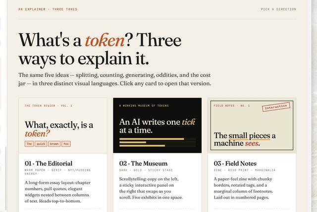 PCWorld记者实测中,Claude Design生成的AI Tokens科普网页原型总览(图源:PCWorld)