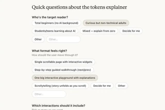 Claude Design生成AI Tokens科普网页前,向用户发起的交互式需求调研界面(图源:PCWorld)