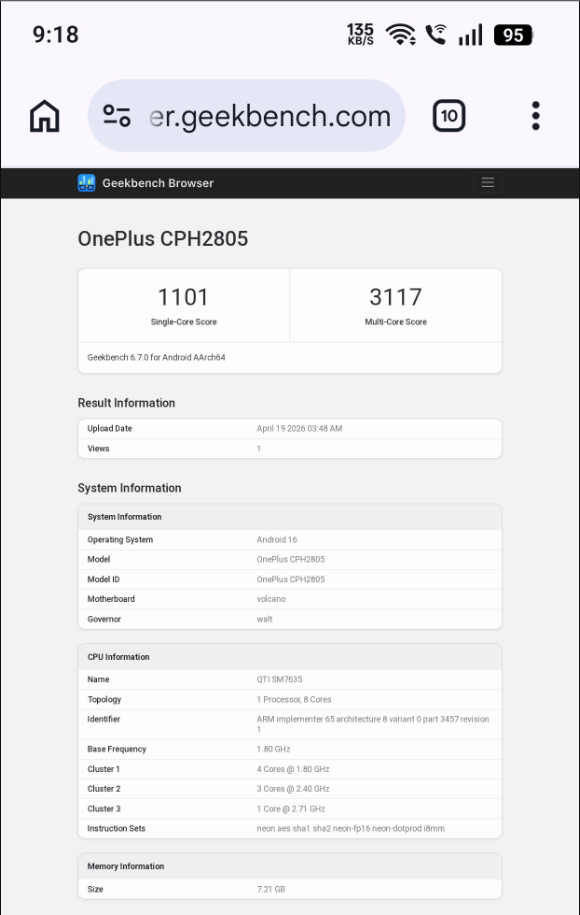 Geekbench显示,一加Nord CE 6搭载了一款八核芯片组,核心配置包括一个主频2.71GHz的大核、三个主频2.40GHz的中核以及四个主频1.80GHz的小核,配备Adreno 810 GPU,这一配置与高通的骁龙7s Gen4完全吻合。该芯片也已被应用于摩托罗拉Edge 70 Fusion和vivo T5 Pro等机型。