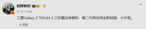 【CNMO科技消息】近日,数码博主“刹那数码”爆料称,三星Z TriFold 2三折叠没有被砍,第二代将采用全新铰链,大升级。此外,博主还表示,由于要平衡功耗,新机内屏分辨率不一定会提高。