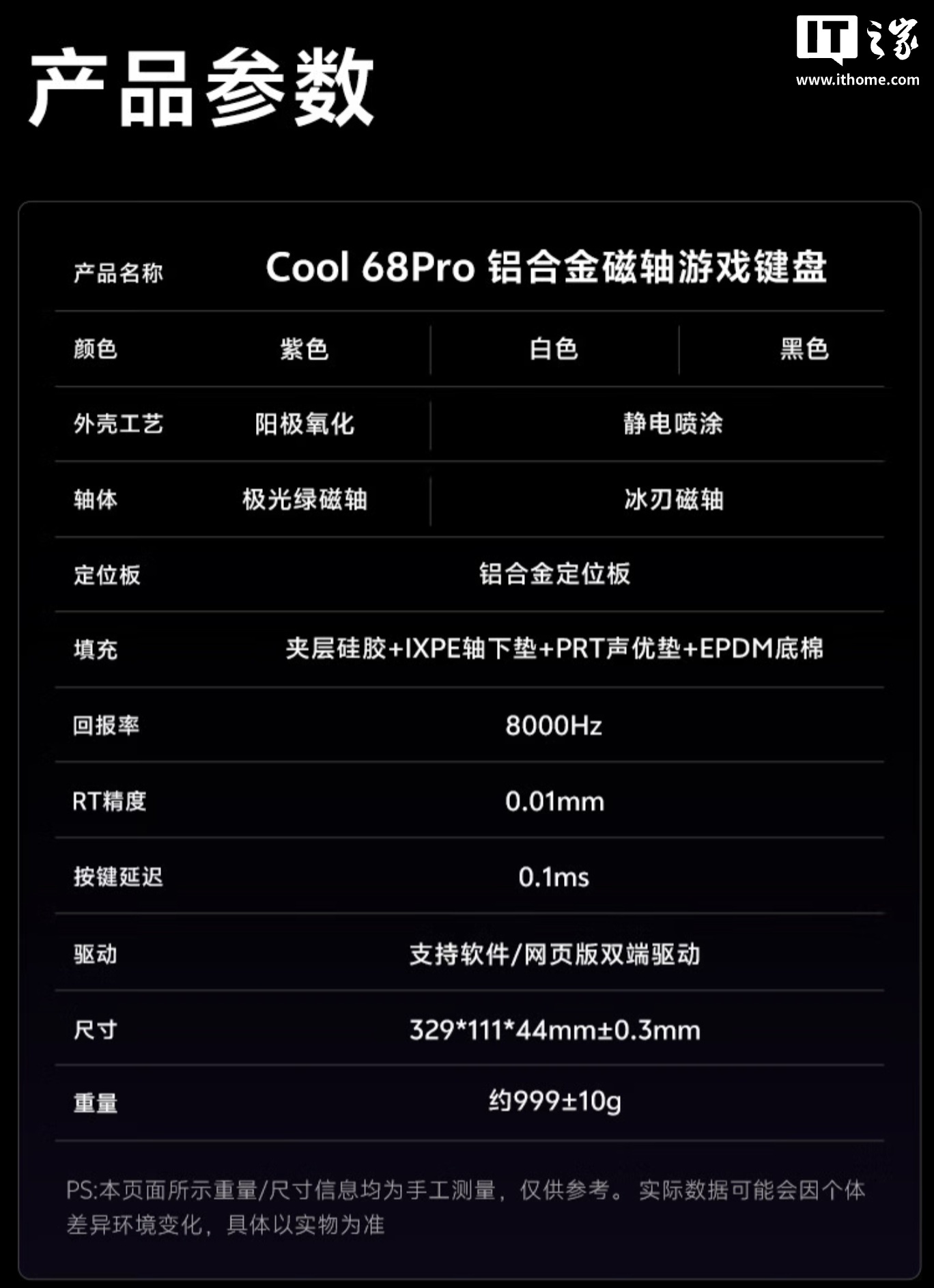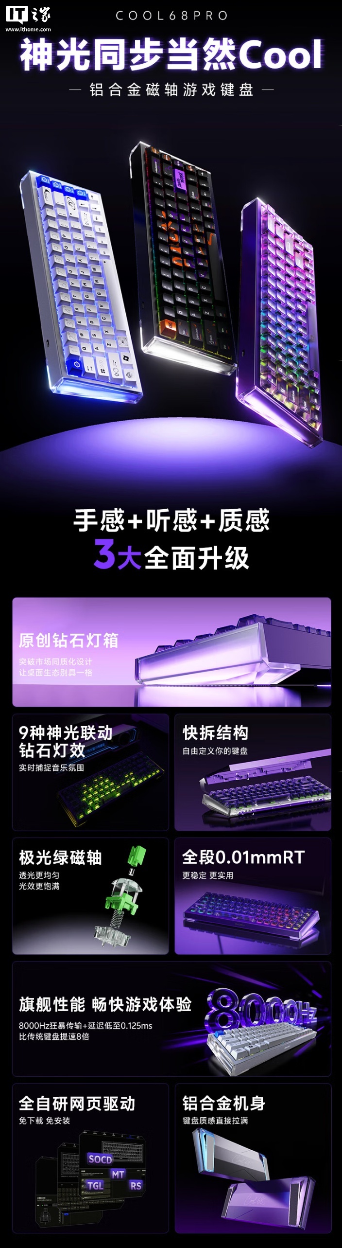 499元起达尔优COOL68 Pro磁轴键盘上市:“钻石灯箱”设计,8KHz回报率 IT之家 4 月 21 日消息,达尔优 COOL68 Pro 磁轴机械键盘今日开售,IT之家整理价格信息如下: 航天蓝 冰刃磁轴:499 元 银河黑 冰刃磁轴:499 元 阳极紫 极光绿磁轴:549 元 系列键盘整体尺寸为 329x111x44mm,重量约 999g,采用“钻石灯箱”设计(半透明外壳),使用 Gasket 结构,搭载音乐律动灯效系统,灯光可随旋律实时同步闪烁。键盘提供 8KHz 回报率,RT 精度达 0.01mm,可选冰刃磁轴及极光绿磁轴。 IT之家附键盘参数: Published by 风君子 独自遨游何稽首 揭天掀地慰生平 View all posts by 风君子