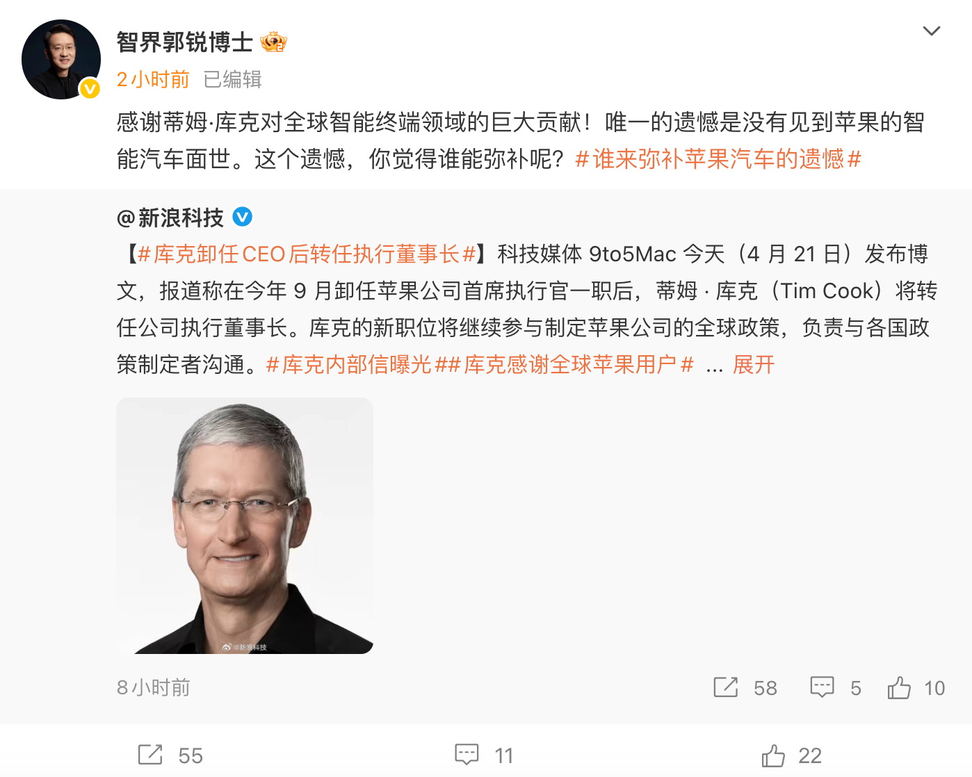 对此,智界汽车董事长兼首席执行官郭锐发文,对库克的贡献表示感谢,并提及苹果智能汽车项目未能落地是其任期内的一大遗憾。