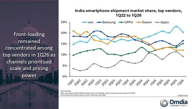 IT之家 4 月 21 日消息,机构 Omdia 在伦敦当地时间今日的新闻稿中表示,印度智能手机市场出货规模在 2026 年第 1 季度降至 3090 万部,同比下滑 5%,这是季节、渠道、价格、汇率和整体宏观经济的共同作用结果。