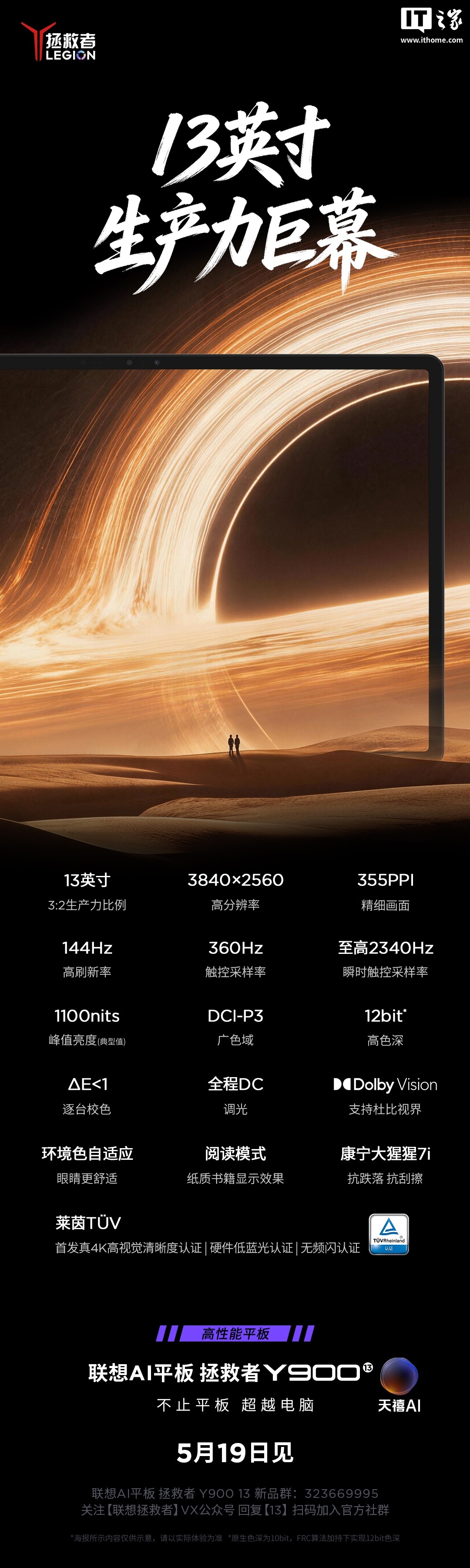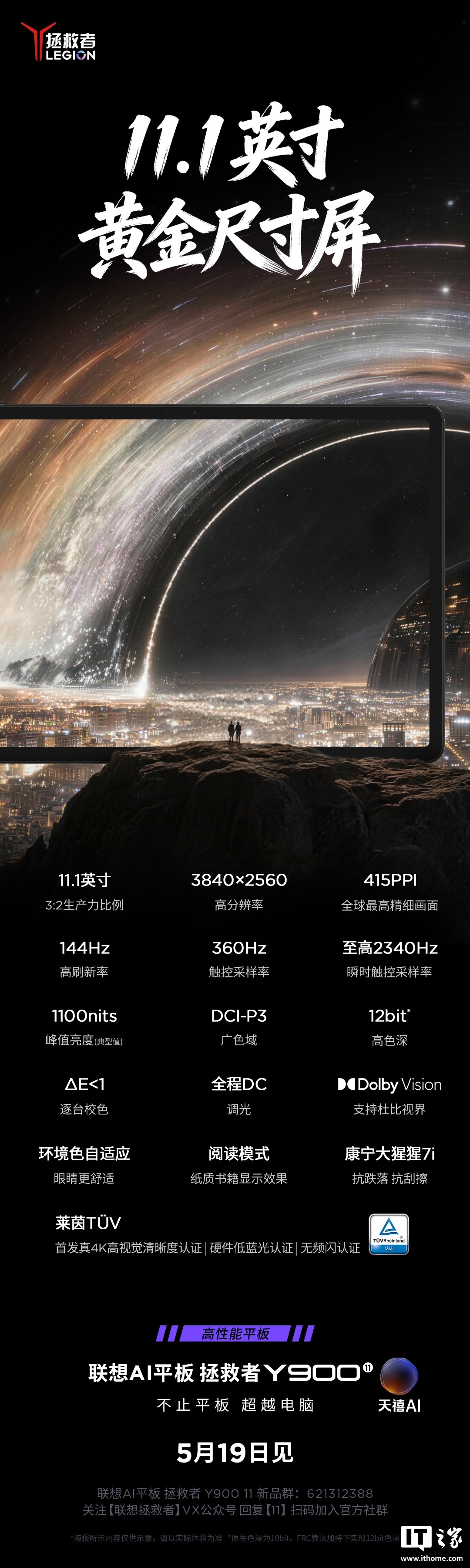 IT之家注意到,联想拯救者平板官方微博今日宣布,联想 AI 平板拯救者 Y900 拥有 11 & 13 双尺寸,旗舰定位,主打“真 4K 屏”,会在 5 月 19 日的发布会上登场。官方还顺势公布了新平板的屏幕参数: