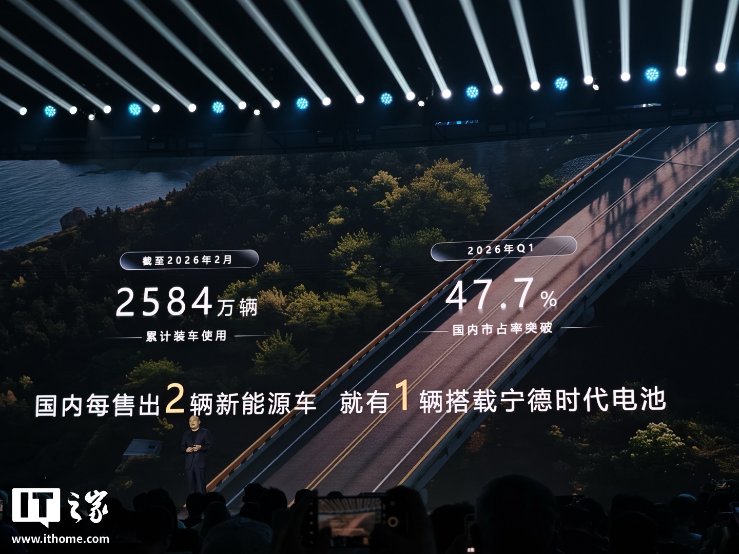 IT之家 4 月 21 日消息,在今天晚间的宁德时代 2026 年超级科技日发布会上,宁德时代首席技术官高焕宣布:截至 2026 年 2 月份,搭载宁德时代动力电池的新能源车已经突破了 2580 万辆。