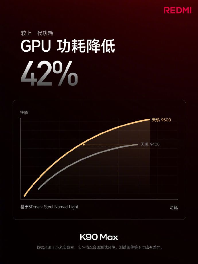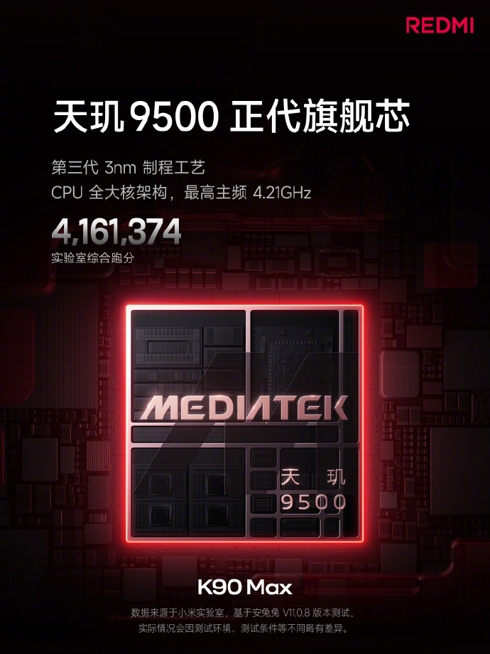 该机搭载全大核架构的天玑9500处理器,综合跑分超416万;集成AI独显芯片D2,图形性能较上代提升33%,功耗降低42%。