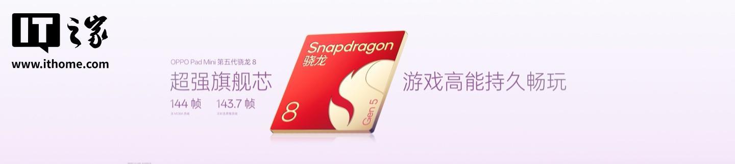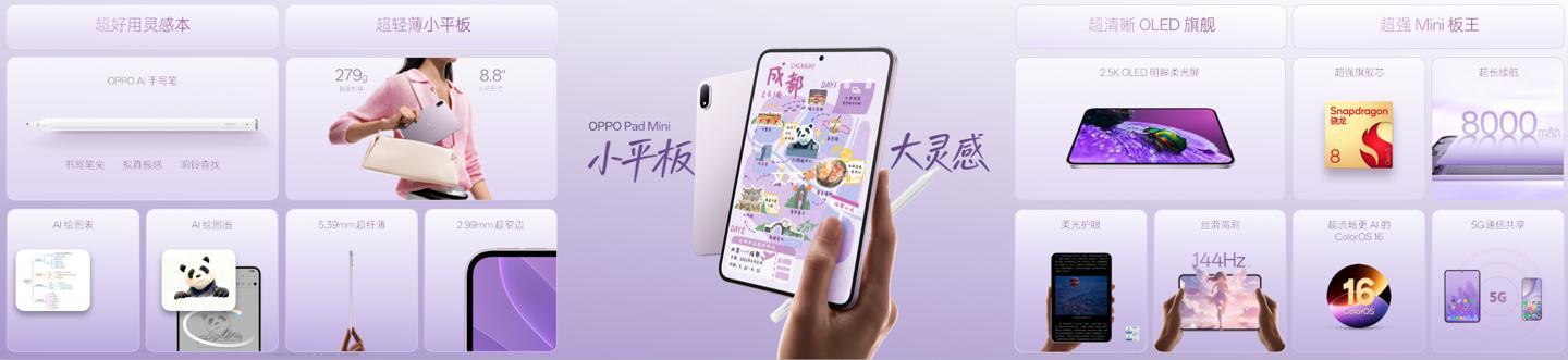 OPPO Pad Mini 平板搭载第五代骁龙 8 旗舰芯,配备 8000mAh 电池;只要 OPPO 手机在身边,无需连热点,无感就有网;支持同时共享双 5G 网络,还能跨安卓、苹果生态实现消息同步与文件互传,可同时连接多副耳机。
