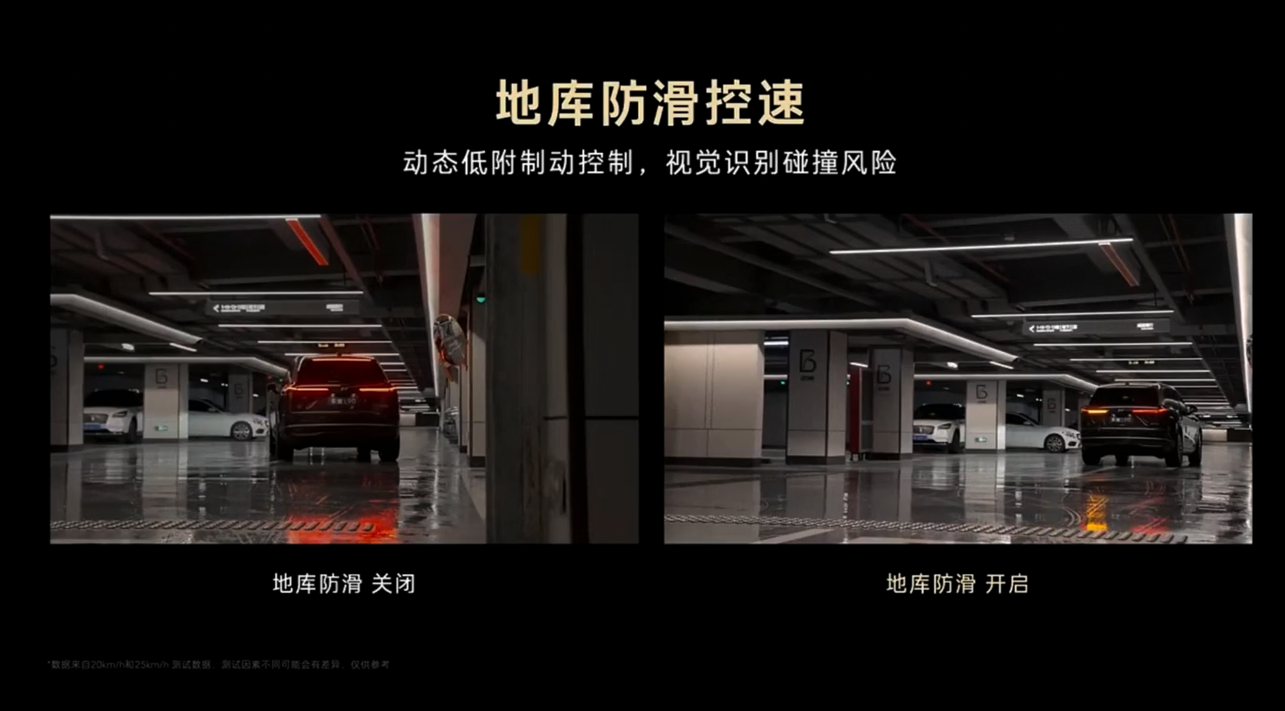 针对地下车库常见的环氧地坪,车辆进行了防滑控速的专项标定,在湿滑的库内地坪上行驶时,不仅能有效缩短紧急制动时的刹车距离,还能在转弯时稳定车辆的操控轨迹。