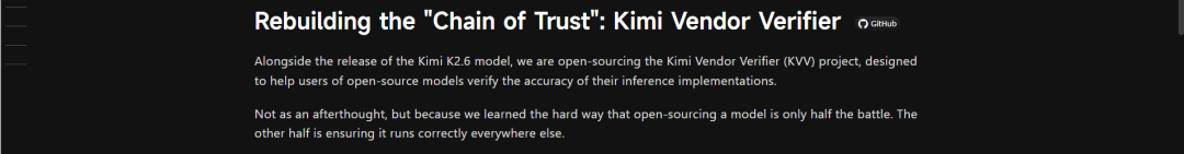 在K2.6的技术博客中,还有一个容易被忽略但十分有趣的事情,那就是月之暗面在开源模型的同时,还开源了KVV(Kimi Vendor Verifier)验证项目。
