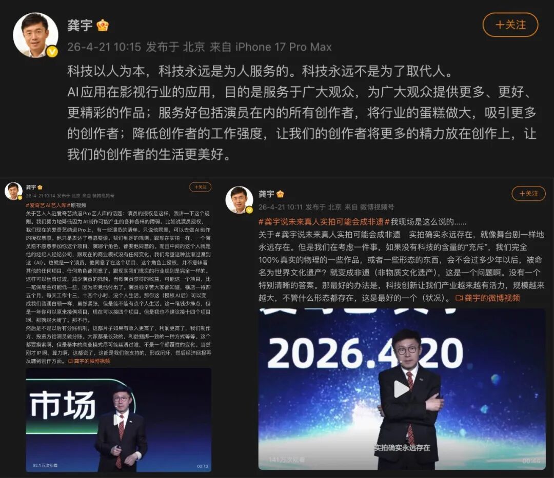 昨天,爱奇艺 CEO 龚宇在微博连发三条帖文,就旗下 AI 艺人库引发的争议公开澄清: