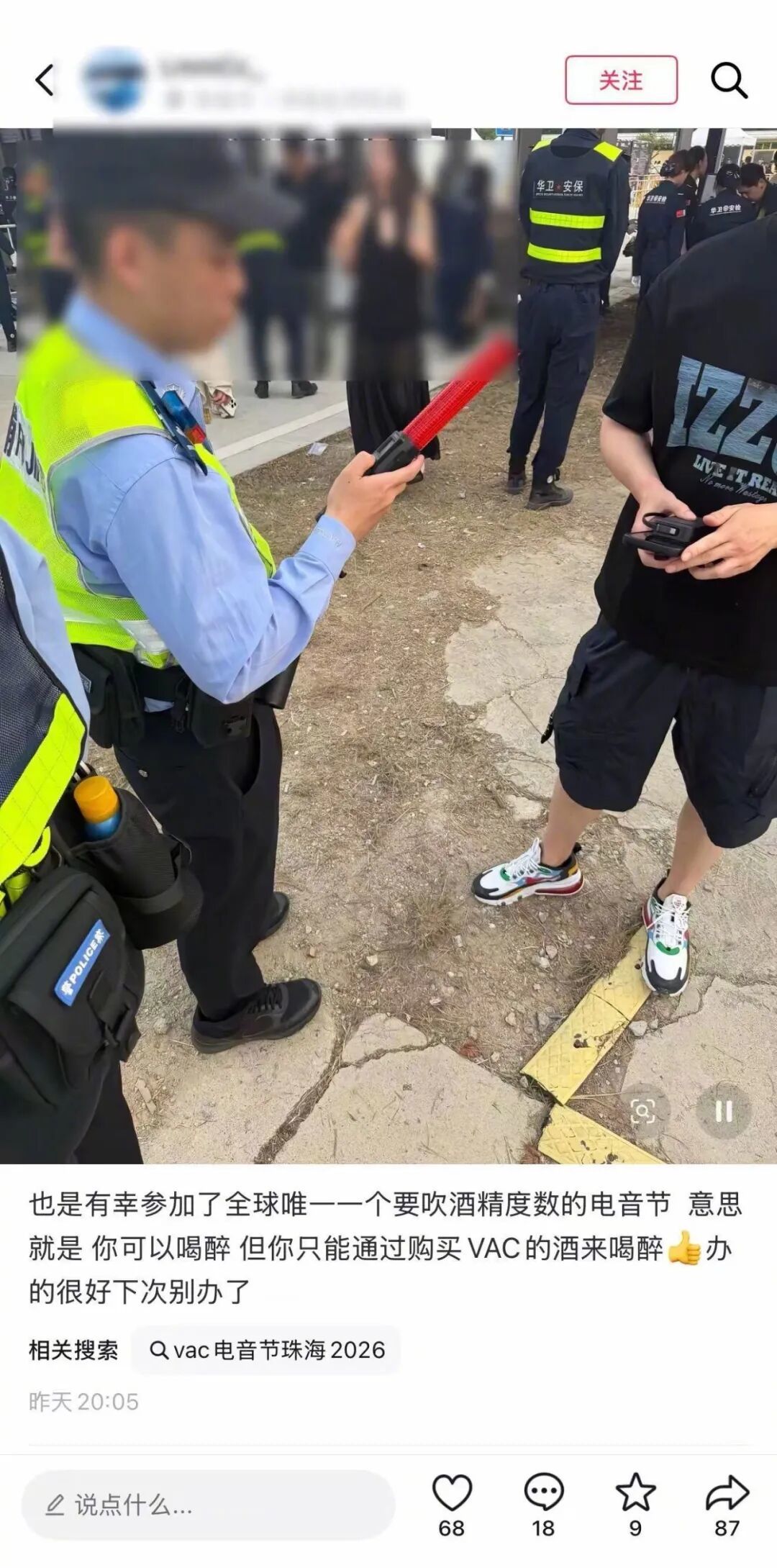 昨日,VAC 电音节指导单位横琴粤澳深度合作区民生事务局工作人员回应称,去年该电音节曾出现观众因饮酒过量引发安全及医疗事故,为避免今年重蹈覆辙,主办方在入场环节新增了酒精检测程序,并同步加强了安保力量。