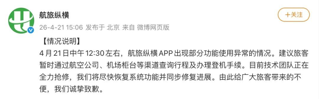 航旅纵横官方于下午发布情况说明,确认故障发生于中午 12:30 左右,技术团队正全力抢修,并建议旅客暂时通过航空公司或机场柜台等渠道查询行程及办理登机手续,同时承诺将尽快同步修复进展。