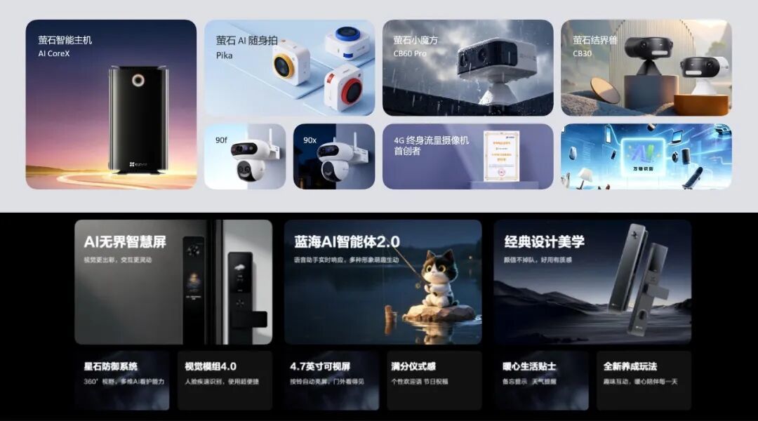 EZVIZAICoreX:本地智慧中枢,搭载蓝海大模型 2.0 与 Home Vita AI 智能体,配备 24G+128G 内存与 64T 算力,支持全屋设备统一管控、自然语言检索录像及自动生成录像摘要,将率先在海外市场首发;