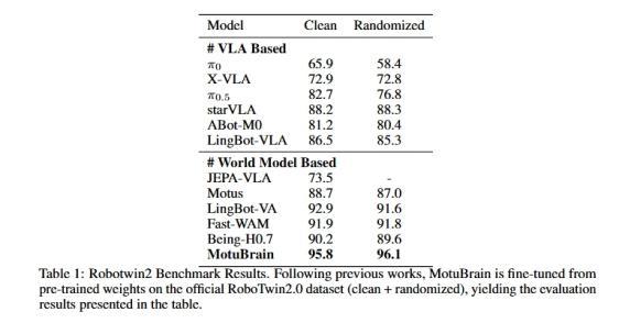 目前关于 MotuBrain 的公开信息寥寥无几,但从这次双榜的成绩结构来看,它背后大概率不是传统的视频模型,也不是单纯的 VLA 或 policy model。