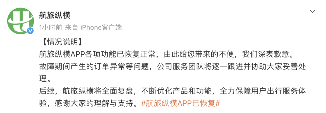 官方表示,APP各项功能已恢复正常,故障期间产生的订单异常等问题,公司服务团队将逐一跟进并协助大家妥善处理。后续,航旅纵横将全面复盘,不断优化产品和功能,全力保障用户出行服务体验。
