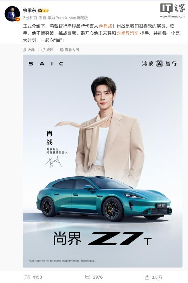 华为余承东官宣肖战成为鸿蒙智行尚界品牌代言人 IT之家 4 月 22 日消息,今天上午,华为常务董事、产品投资委员会主任、终端 BG 董事长余承东在微博发文:“正式介绍下,鸿蒙智行尚界品牌代言人 @肖战!肖战是我们很喜欢的演员、歌手,他不断突破、挑战自我。很开心他未来将和 @尚界汽车 携手,共赴每一个盛大时刻,一起向‘尚’!” 此次官宣同步关联尚界 Z7、Z7T 车型的上市发布,定档于 4 月 22 日 19:00(今晚)举行的鸿蒙智行春季新品发布会将全面揭晓新车信息。IT之家届时将为大家带来详细报道。 Published by 风君子 独自遨游何稽首 揭天掀地慰生平 View all posts by 风君子