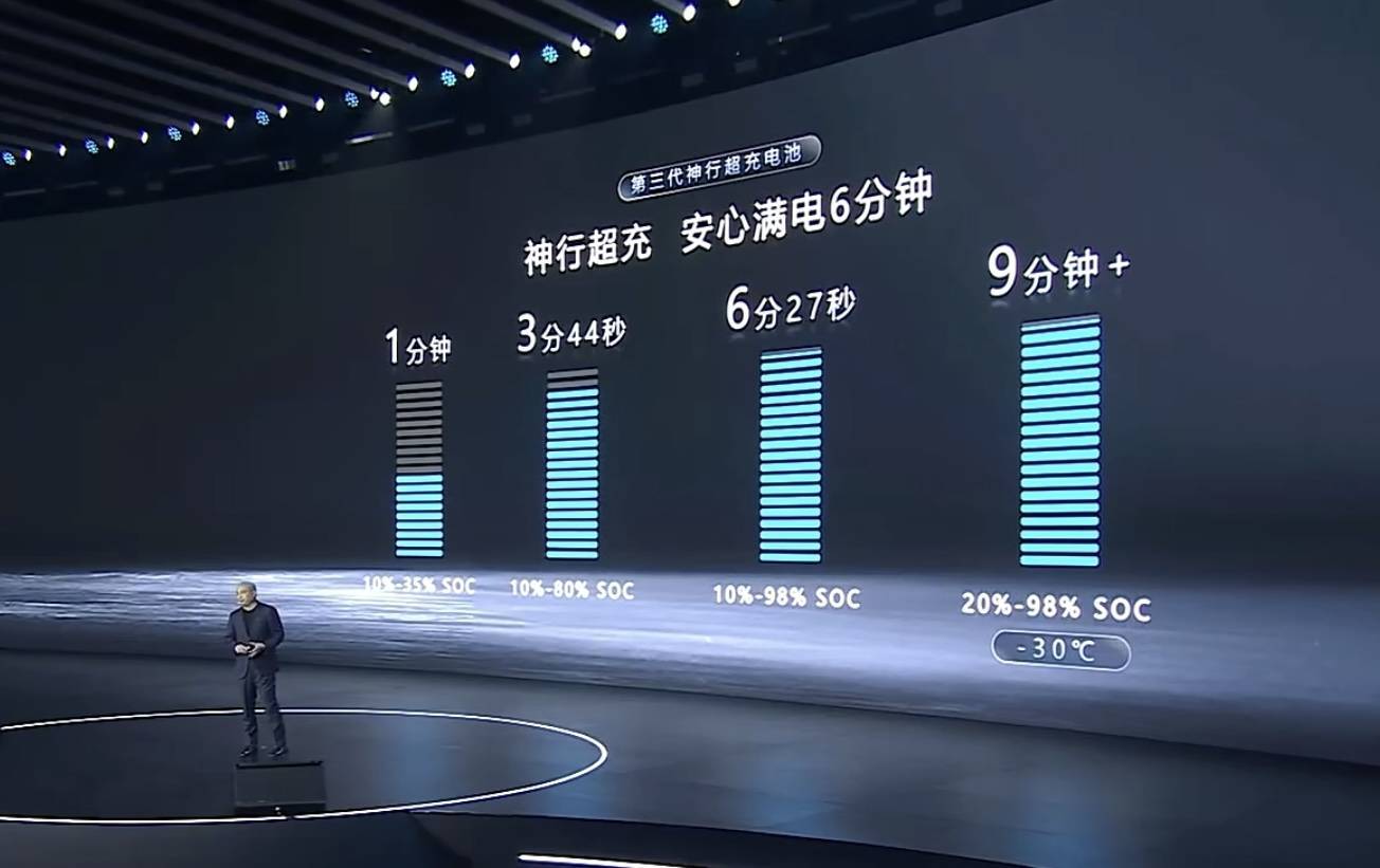 第三代神行超充电池充到 80% 只要 3 分 44 秒。充到 98%,仅仅 6 分 27 秒。